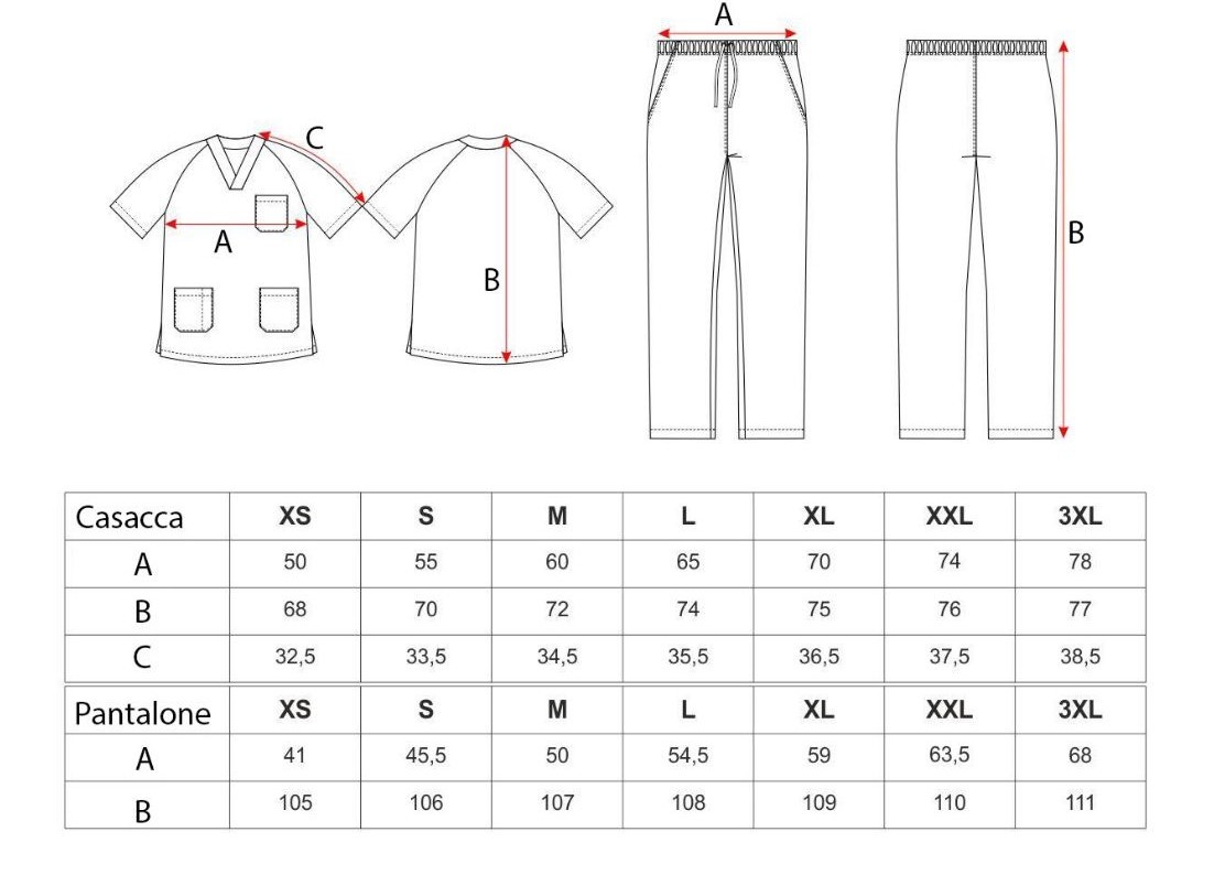Misura (A - Larghezza/ B - Lunghezza/ C - Lunghezza manica)