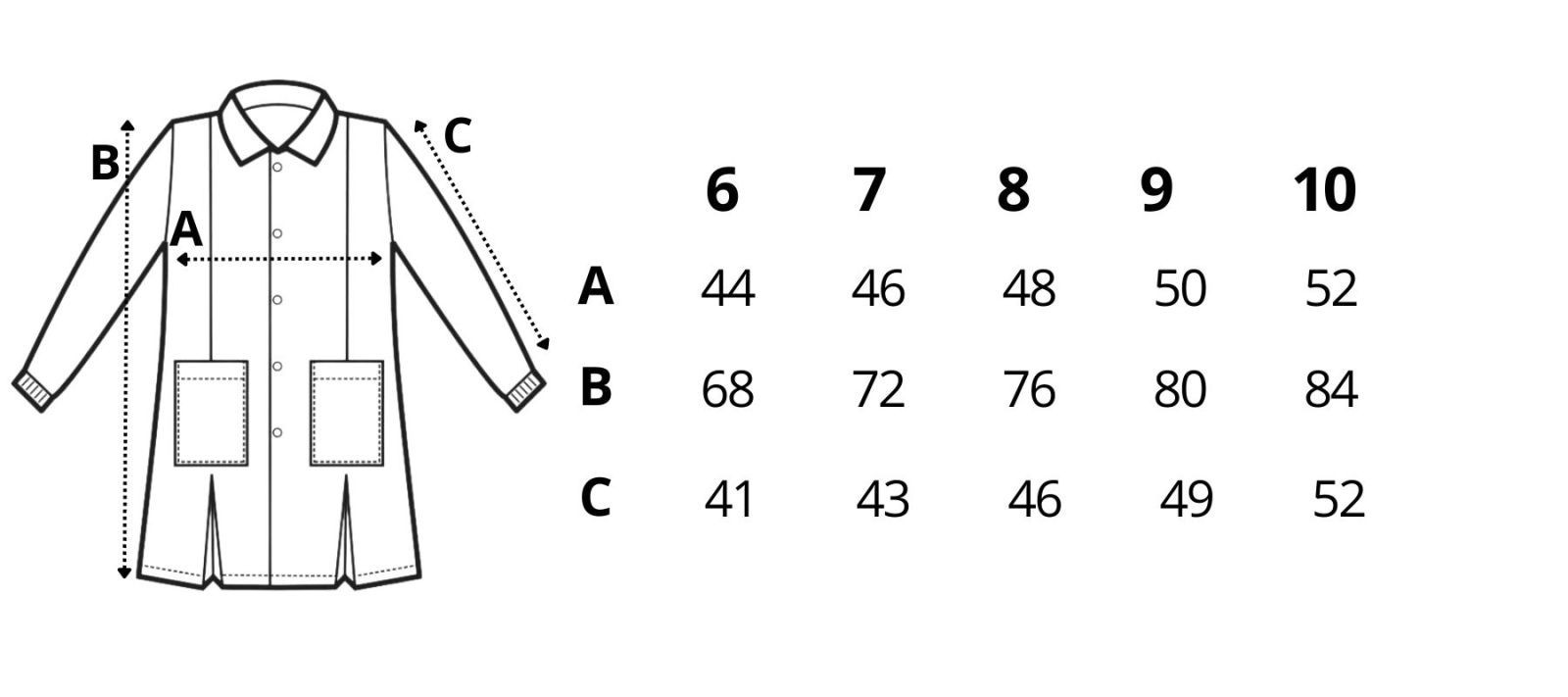Misura (A - Larghezza torace / B - Lunghezza dietro / C - Lunghezza manica)